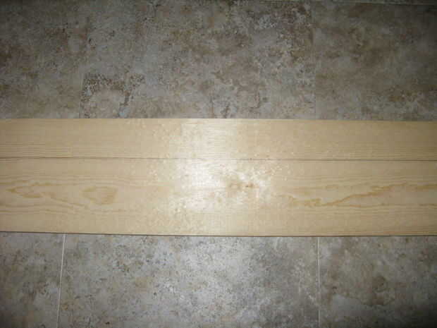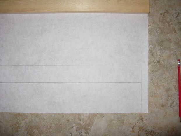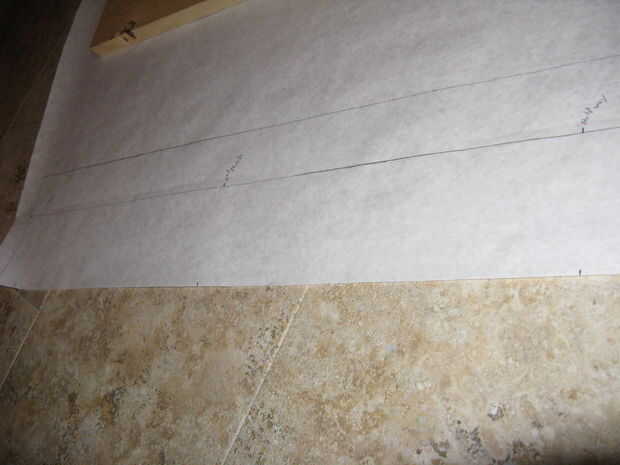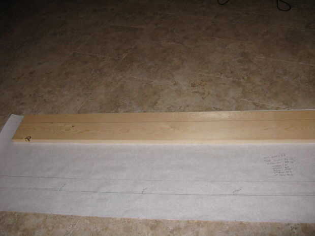Primero coloque el 1 x 6 en el estante como cuando será su final. Luego detrás el 1 x 6 y trace una línea contra el marco para que sepas donde la estructura comienza (para que sepas exactamente cuánto madera tienes que trabajar con). En esta tengo exactamente 3.5" para trabajar con. Después de dibujar en la parte trasera de la tabla de ir a buscar algún papel de carnicero. Sacar el tablero y la línea para que sea una perfecta representación de la Junta.