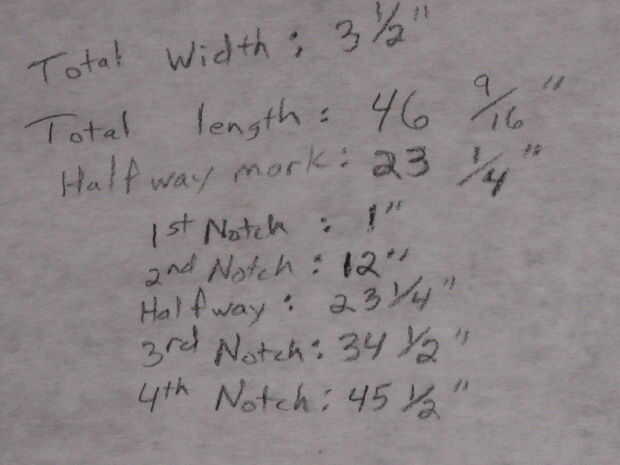Ahora hacer los números. En mi caso la primera muesca es 1", 2 ° muesca 12", es de marca a mitad de camino (no una muesca) 23,25", muesca 3 muesca 34,5" y 4 "sí sé su no exactamente incluso pero su pretty darn cierre 45,5 y se ve bien:-p