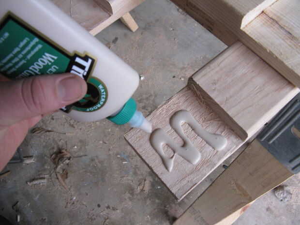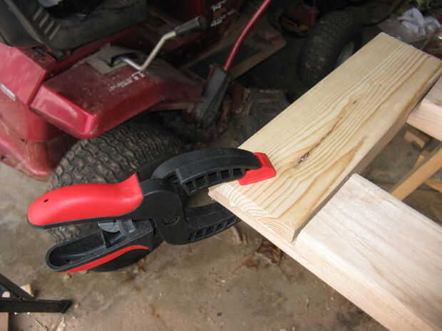 Poner pegamento en uno (que es demasiado en la foto por cierto) y luego coloque el 12" pieza en la parte superior que se mueve alrededor para probar y para extender el pegamento (o usted puede rodar alrededor con un rodillo pequeño o un trapo viejo para obtener una distribución uniforme de pegamento). Abrazadera a perforar algunos agujeros y atornillar los tornillos de drywall en. Después de poner los tornillos pueden quitar la abrazadera (si tienes un número limitado de las pinzas) y mover su pinza para el siguiente spot para encolar encima. Repita este proceso para todos los estantes de 6.