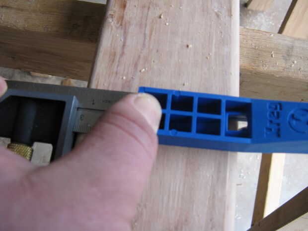 La escuadra de combinación funcionará como respaldo de la plantilla para ayudar a establecer la distancia desde el borde. A continuación ajustar la plantilla. Taladre el agujero y luego mover el jig hasta el siguiente hoyo. Taladrar 4 orificios en un lado 46,5" y 2 en ambos de los lados de 12" para un total de 48 agujeros.