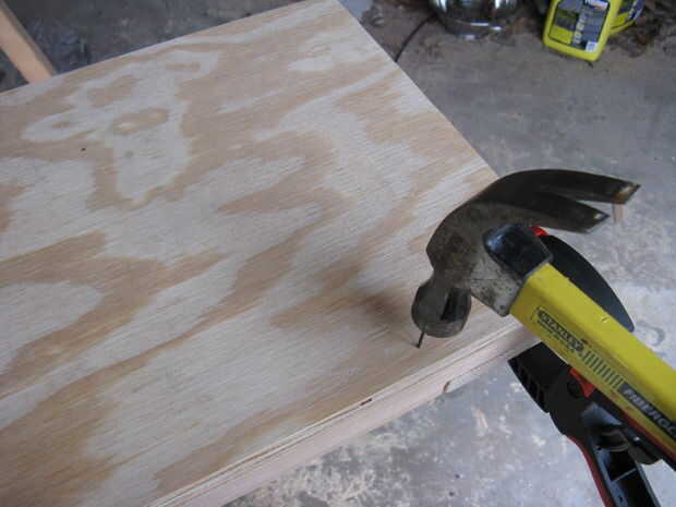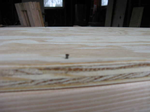 Después de comprobar el ajuste, tomar la madera apagado, poner pegamento en él (el pegamento alrededor de una mejor cobertura en extensión) y la madera contrachapada en él otra vez (mejor hacia arriba) tratar de colocarlo para que el frente quede al ras, porque se verá más que la espalda de todos modos. Si los lados son cortos entonces tratan de dividir la diferencia. Una vez que esté colocado, la madera hasta el marco de la abrazadera en las 4 esquinas. Derribar su clavo clavos (1.5") de acabado la madera contrachapada con al menos 2 clavos en el lado corto y probablemente 4 o 5 en el lado largo. No clavo todo el camino, deje aproximadamente 1/8" de pulgada por encima de la superficie y terminar con un juego de clavos para que sea sólo un poco debajo de la superficie de conducción. Volver sobre los clavos con masilla de madera puede manchar. Deje que todo se seque como la botella de pegamento dice entonces arena las manchas de masilla madera planas.
