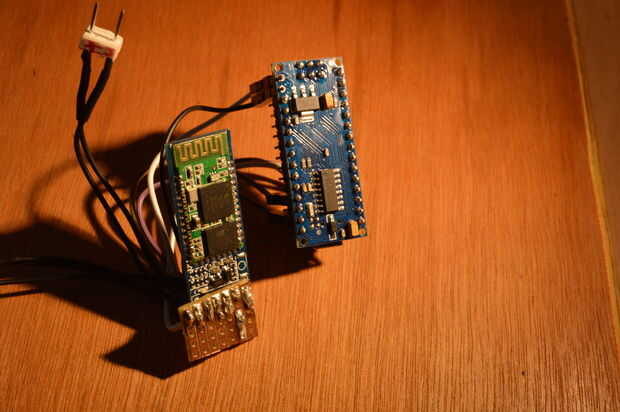 En el cuadro de placas de circuito impreso, puede ver el módulo de bluetooth, el arduino nano y un poco de PCB que usé para conectar todos los cables y puentes para. Esto era mantener todo relativamente ordenado y me permitió establecerá una masa común conectar a tierra de arduino como sólo tenía 2 pins para la tierra y necesitaba algunos.