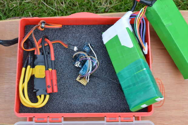 En la foto de la caja de plástico a la izquierda es la salida que tiene una cinta de velcro manteniendo apretado. En el centro es el módulo arduino y bluetooth con un poco de pcb para organizar los cables. A la derecha es la batería de seis celdas que modifiqué en dos 3 células Unidas entre sí pero comparten un enchufe de equilibrio.