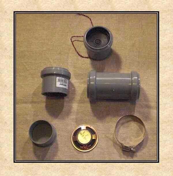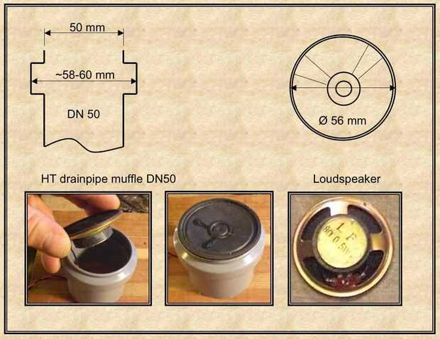 Sólo tres piezas son necesarias para esta caja. Primera un viejo altavoz de un pc viejo (0,-Euros), y luego un HT desagüe mufla (también llamado socket doble) DN50 mm (unos 1,50 Euros) y al menos un desagüe oculto para DN50 mm (unos 0,50 Euros). Las piezas de tubo de drenaje pueden ser bouhght en cada tienda de homeimprovement.