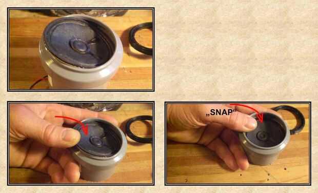 Para poner el altavoz en el anillo de Junta de la toma del desagüe, póngala en un tornillo de banco. Pulse ahora el tubo lentamente un poco junto hasta que el altavoz se pone en movimiento. Luego tomar la toma de la mordaza. Ahora presione el altavoz cuidadosamente y suavemente con los pulgares en. Funciona muy fácil y se escuchará un "Snap". Y eso es todo.