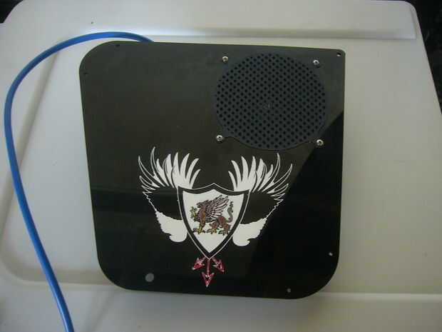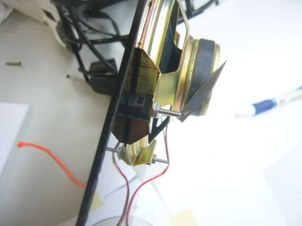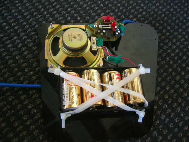 La segunda imagen muestra los espaciadores de plástico utilizados para la interfaz con el montaje del altavoz de la caja de auge. Observe también el cordón sosteniendo el cable cat5 azul a la tarjeta de circuitos que sirvan de alivio de tensión en el caso el cable debe siempre obtener tiró en. Esto resulta absolutamente necesario.