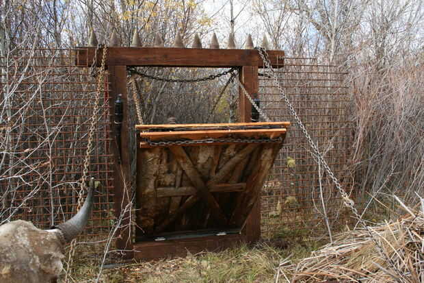 Tuvimos alguien parado detrás del marco y apoderarse de ambas cadenas. Con la ayuda de otra persona hacia fuera en el frente, nos planteamos el puente levadizo a la posición vertical. Entonces el puente levadizo fue bajado lentamente por el "Ghoul", sosteniendo los extremos de la cadena. El resultado fue un ominoso "chunk, chunk, chunk" como cada eslabón de la cadena se deslizó a través de los anillos en el interior del marco. (Decidimos ir con un manual más bajo y tener nuestro greeter macabro con los huéspedes aquí, pero no tarda mucho la plataforma de los extremos de la cadena hasta el cable de un cabrestante y levantó y bajó automáticamente).