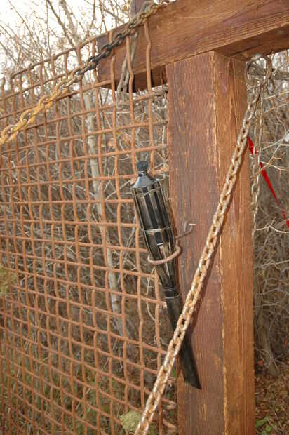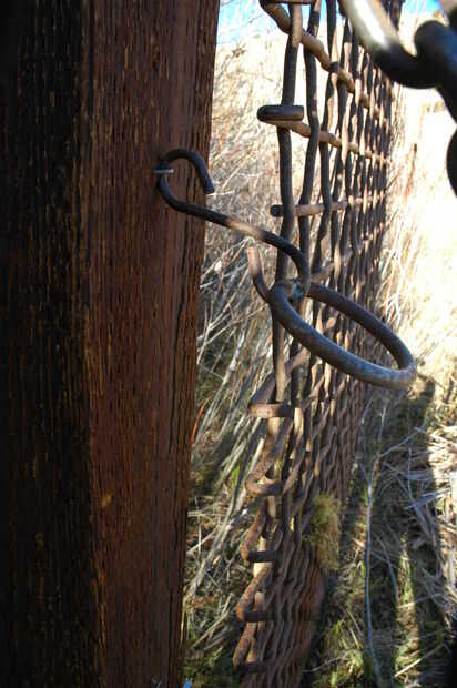 De las antorchas, empezamos con algunos grandes antorchas Tiki que encontramos escondidos lejos en el granero. Cortamos la parte inferior en un ángulo para dejar una cola de 20" de largo (esto puede ser lo que parece justo a usted). Había pintado negro y lleno de aceite. Porque queríamos una llama grande, hemos quitado el tornillo en la tapa con fieltro y rellena la abertura con una mecha más grande (tira de tela de algodón de 5 "x 8" enrollado firmemente a lo largo) y que cerca de 2". Luego nos hicieron 2 anillos más (al igual que los de marco-ver instrucciones) y soldados cada uno a un gancho en S que formaron fuera de una pieza de 3/16" varilla de acero (hemos doblado los extremos en direcciones opuestas alrededor de un tubo de acero de pequeño diámetro). Atamos el extremo de los ganchos de s a la estructura (uno cada lado) con cercado de grapas, se deslizó las antorchas a través de los anillos y coloca un pequeño tornillo por la parte inferior de la pieza de cola sólo para la estabilidad agregada.