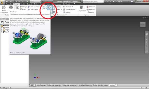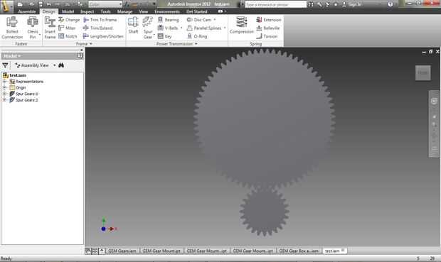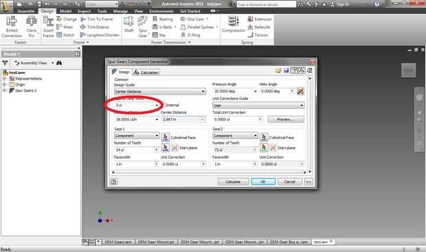 Ahora que se han determinado los parámetros de cambios necesitamos utilizar AudoDesk Inventor (2012) o una solución equivalente de CAD a diseñarlos. El inventor era ideal para este proyecto ya que tiene un engranaje de estímulo generador que lleva en sus parámetros y calcula y representa el diseño del engranaje final. Esta herramienta no, sin embargo, montará todos los engranajes en una caja de engranajes, que guardaremos para el siguiente paso.