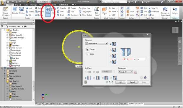 Ponga un agujero en el centro de cada engranaje abierto uno de los componentes del equipo y crear un dibujo nuevo sobre la faz de la marcha. Seleccione el "punto" del grupo "Dibujar" y coloque un punto en el centro de la marcha. Terminar el dibujo y seleccione la herramienta "Agujero" de dentro del grupo de "Modificar". Seleccione el punto de que crear y definir el diámetro del círculo para ser igual al diámetro de la barra de acero que va a utilizar (en mi caso 1/4 pulg.) El tipo del agujero debe ser un simple agujero. Repita este proceso para todos los engranajes restantes en su diseño. (Ver primera figura)