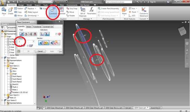 Una vez que el eje de todos los engranajes están vinculados deben restringir la cara de cada pareja vinculada con un desplazamiento. Esto arregla por lo que se compensan entre sí y libre para rotar. (Ver tercera ilustración).
