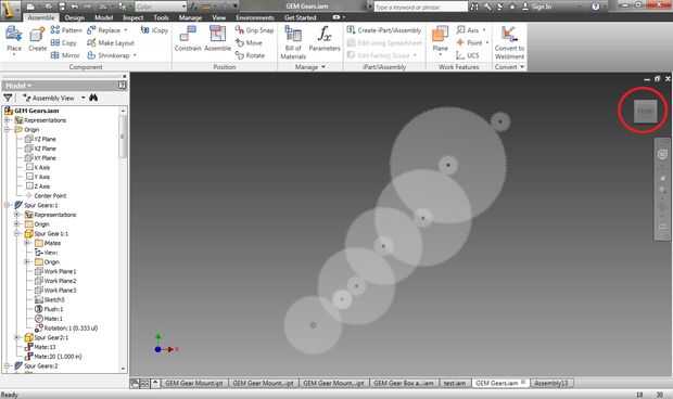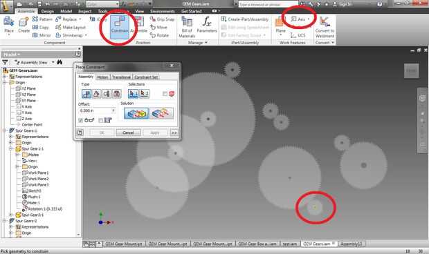 Dientes se acaban ahora. Ahora puede empezar a vincular todo el material fija junto con la creación y la restricción de su eje de rotación. Primero seleccione la herramienta de "Eje" dentro del grupo de "Funciones de trabajo". Seleccione el agujero creado para el eje. Repita para el otro equipo que desea enlazar a este. Una vez haya creado un sistema que empareja del eje que puede hacer clic en el elemento de "Restringir" en el grupo de "Posición". Restringir los dos ejes ha creado haciendo clic en ambos y aplicar la restricción. Continuar haciendo esto por los orificios restantes. Los conjuntos de engranajes pueden vincularse en cualquier orden. Elegí empezar con el más grande del engranaje y vinculado progresivamente el engranaje más pequeño siguiente hasta que todos estaban vinculados. Debe restringir el eje de rotación de un gran engranaje en el eje de rotación del pequeño engranaje del conjunto que se une con él. (Ver segunda figura).