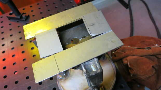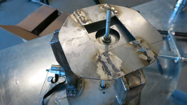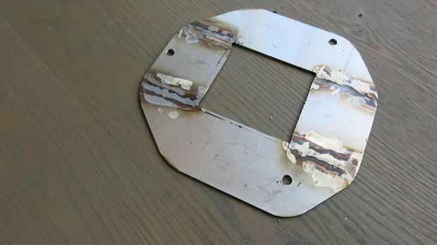 • Taladro y golpee tres agujeros, alineados con las tuercas, de modo que el rectángulo de chapa se puede empernar a la cubierta de la toma de la última etapa.