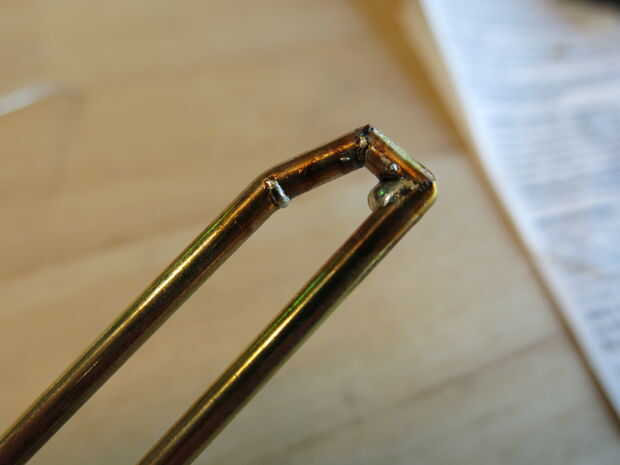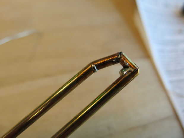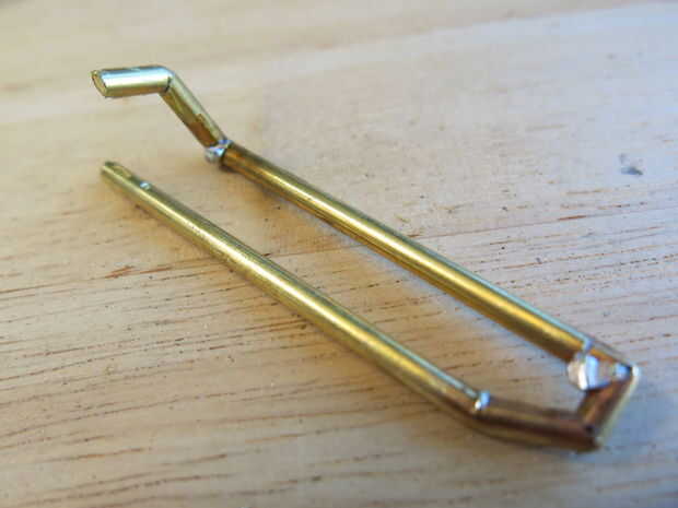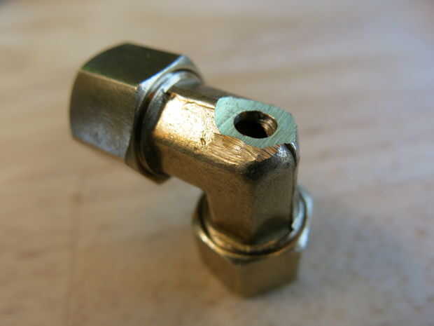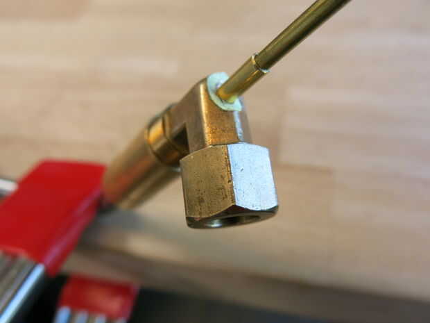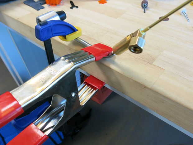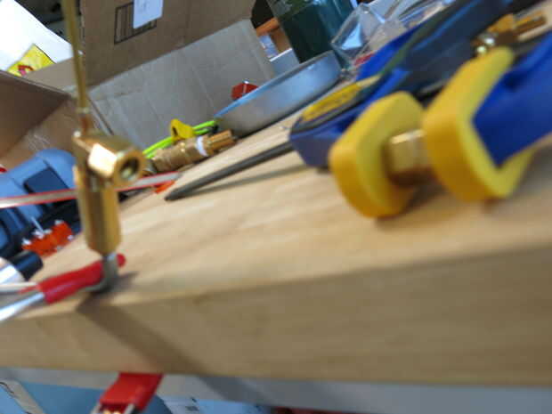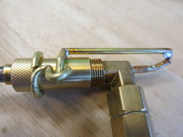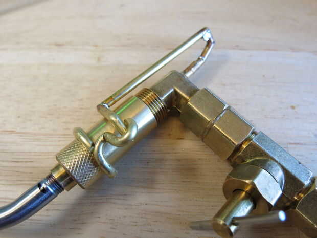 El regulador vino con una segunda válvula construida en el extremo del regulador, que decidí usar como válvula de encendido/apagado. Esto se logró doblar varilla de latón en formas extrañas, y formando a una especie de Asamblea de gancho y pestillo en el extremo del regulador y empuje abierta la válvula incorporada. Esto implicó la perforación a través del extremo de un codo de latón y con resina de colocar un pequeño trozo de tubo de cobre en el lugar que se hizo una Unión estanca a los gases, sin embargo, deslizable.