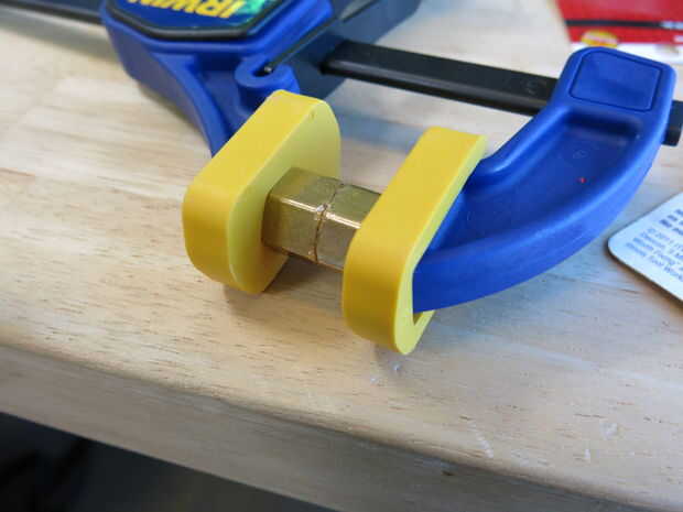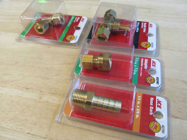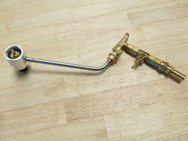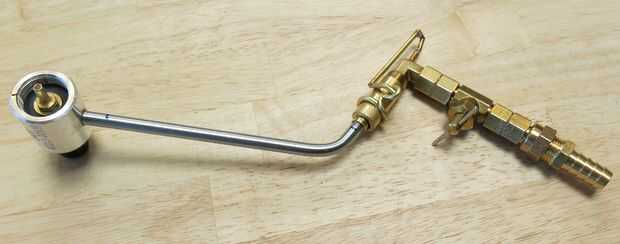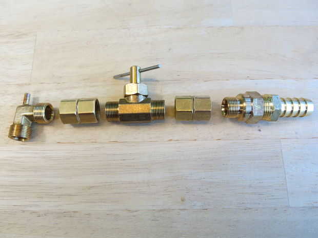 Una variedad de adaptadores de tubería se utiliza y ajustaron juntos liberalmente para formar un sistema de válvulas y accesorios que regular el flujo de propano con no haya fugas y terminan en un adaptador de lengüeta de la manguera 5/8". Todo este proceso fue difícil y tiene que haber sido una mejor manera de hacerlo, pero esto es lo que he hecho trabajo.