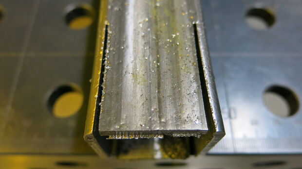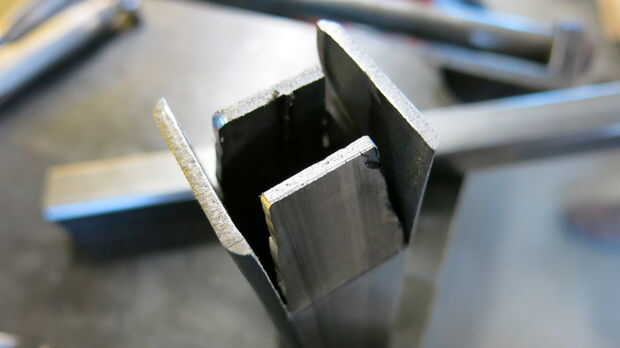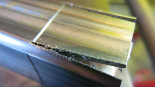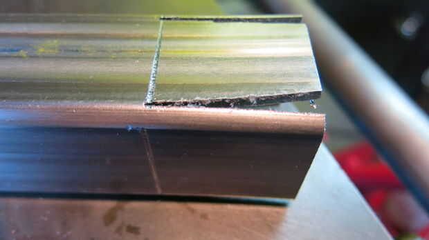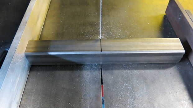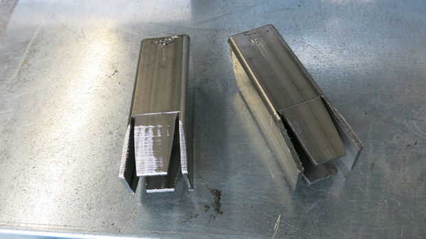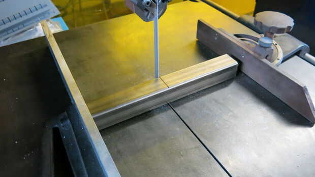 - Una vez doblado, utilice la Sierra de cinta vertical para recortar a exceso del metal a cada lado. Son piezas en forma de triángulo similares a lo que marcamos en la parte superior.