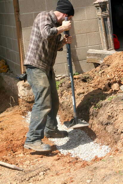 Una vez que tienes una buena zona de la pared, colocar una capa base de grava. Hicimos nuestro aproximadamente 4 pulgadas de espesor y apisona real bueno. Esto proveerá drenaje de fondo de la pared, permitiendo que el agua drene lejos a través de la grava en vez de empujar los lazos del ferrocarril hacia fuera o erosionando la suciedad de la pared.