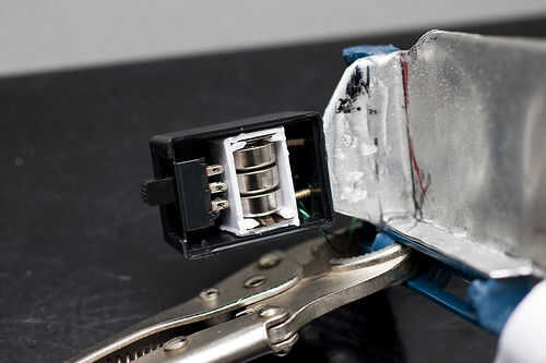 -Coloque el soporte de la batería y el interruptor utilizando epoxy para sostener en el caso de proyecto y sellar con la parte posterior del caso