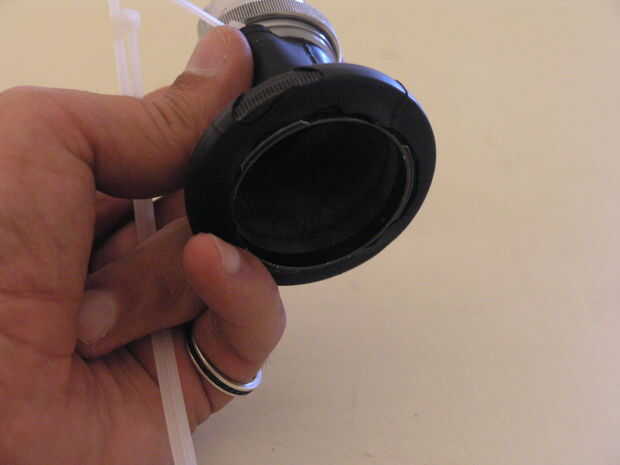 Ahora deslice uno de los extremos del tubo en el extremo posterior de la lente, tienen apenas lo suficiente para una sujeción segura en el lente.  Coloque una brida de plástico alrededor del tubo y la lente y tirando firmemente.  Ahora coloque el otro extremo sobre el adaptador de montaje.  Esto es difícil y usted puede trabajar la goma un poco para aflojar o su defecto Utilice alicates para estirar el material sobre el Monte teniendo cuidado de que el tubo y la lente de punto muerto en medio el adaptador.  Por último, zip atar el tubo al adaptador y recortar cualquier exceso lazos y innertube debajo el adaptador para lograr un montaje al ras para su cámara.