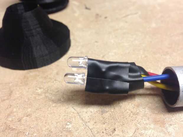 Los LEDs tienen los cables positivo soldados a la resistencia. La resistencia entonces se suelda al cable rojo. Se sueldan los cables negativo al hilo que coincida con el color del LED. Cuando se aplica una batería externa, el ojo es capaz de brillar ya sea azul o amarillo. (Cable rojo va a positivo, cualquier color usted lo quiere a brillar va a negativo)
