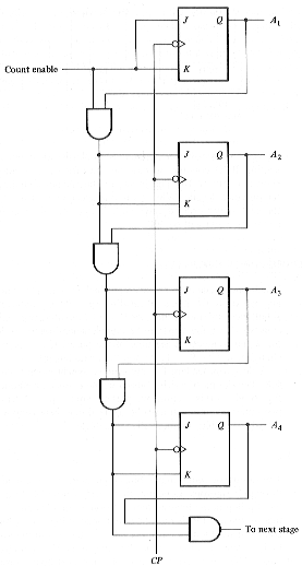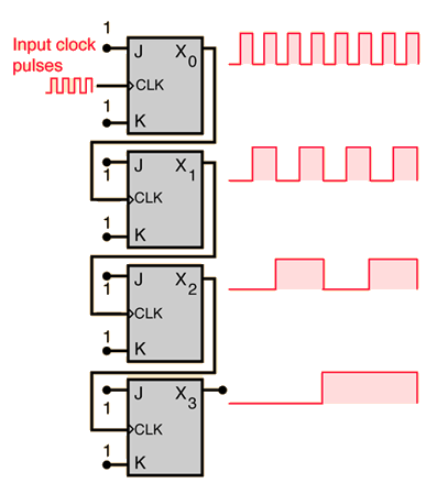 Si conectas la salida de un JK flip flop a otro y en cascada a ellos el resultado es un contador binario que actúa como un odómetro. Esto es porque como el primer flip JK flop en la secuencia va alta y luego baja, que provoca el otro en la secuencia. Frecuencia del reloj (Cuántas veces enciende y apaga un segundo) se reduce a la mitad con cada sucesiva adición de flip flop JK. Por esta razón un flip-flop JK es también llamado un circuito se dividen en dos. El patrón resultante de cuatro fracasos de tirón de JK será 0000, 0001, 0010, 0011, 0100, etc....