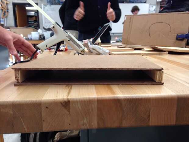 Luego conseguir otra pieza de 9 x 12 de madera contrachapada y conectar a las dos partes con una pistola de pegamento caliente. Esto va a ser utilizado como la parte superior donde el papel se va a ir. Agarra un 9x9x.5 pulgadas de madera cuadrada para la base del organizador del suministro.