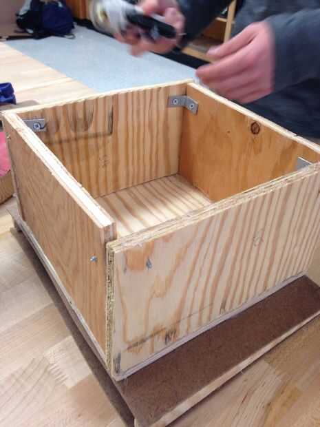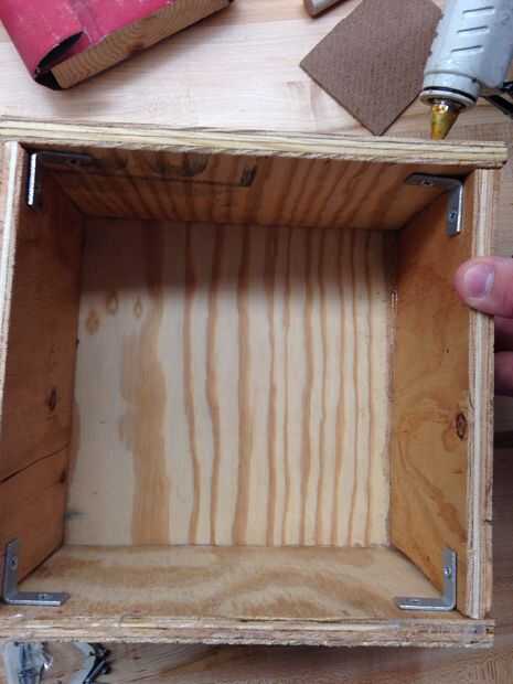Super pegamento dos de 9 x 5 pieza de madera contrachapada y dos de 8 x 5 piezas de madera a los lados del tablero de madera contrachapada de 9 x 9 pulgadas base. Estos van a ser utilizado como la parte del organizador de la fuente. Una vez hecho esto con va a ser clavado por abrazaderas de las esquinas en cada esquina del organizador de la fuente.