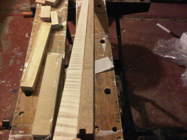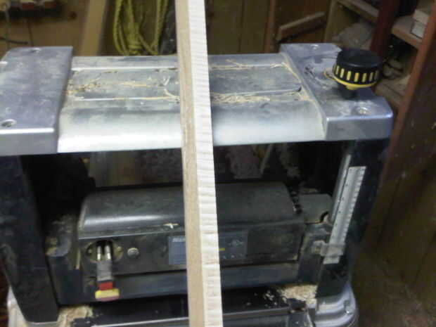 El roble que utilicé para los lados se preparó con tiempo para otro proyecto pero el proceso para dimensionarlo es muy simple. Usé mi sierra de mesa para corte tira fina de un tablero de 1 1/2 "X 3/4". Empecé con 1/8" de espesor por 1 1/2" corte ancho áspero entonces había puesto en una placa de soporte creo de 3/4" y funcionó a través del planificador de espesor. Ir fácil y muy, cortes muy ligeros, como te acercas el 1/16" de espesor lo conseguir delicado. La Junta podría romper fácilmente en la máquina de envío de lanzas de roble cuando todos a una gran velocidad. Usted puede evitar esto potencialmente mortal a venir utilizando 2 echó a un lado cinta para adherir las tarjetas a la placa de soporte.