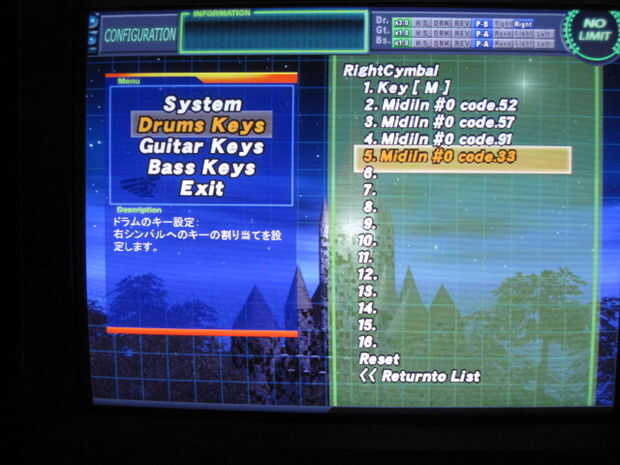 Si es conectado a una entrada que ya está asignada a DTXMania, como el platillo derecho, debe ser preparado para el siguiente paso. Si conectado a una entrada que no ha sido utilizada en DTXMania, inicie DTXMania y vaya a configuración - llaves del tambor. Escoge una plataforma para usar como la almohadilla de palo de mano derecha. Usé el platillo de la derecha. Después selecciona el botón, obtendrá una pantalla que muestra todas las entradas midi asignados para ese canal. Desplácese hacia abajo hasta una ranura vacía, presione entrar y golpear el palo con otro palo de su. Esto debe agregar una entrada en la lista correspondiente al midi asignado a la entrada de cerebro de tambor. Que golpear los palitos juntos para que usted sólo genera la entrada de mic de palo.