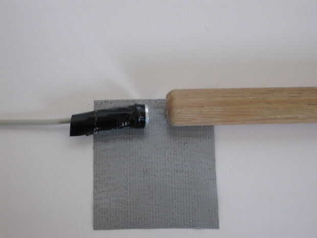 Corte una longitud de cinta (no el tipo de vinilo, las cosas más suaves, con paño) cerca de 2,5 pulgadas (para un palillo 5BN). O hacer la cinta un poco más larga y se puede recortar en un paso posterior. Coloque el lado pegajoso hacia arriba y coloque el micrófono en un borde y el palo opuesto, el extremo hacia el micrófono. Mantenga sobre un espacio de 1/4" entre ellos (la espuma tendrá que caber allí). La idea es que el stick debe vibrar independiente de la cubierta del micrófono. Por ejemplo, si pulsa el micrófono directamente en el extremo de la vara, será menos sensible.