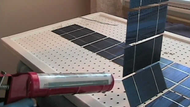 Después, tuve dos cadenas completados, he podido seguir adelante y mi cable de bus en uno de los extremos que unen las dos cadenas de células solares de la soldadura. Ver parte 5 y parte 6del video para ver cómo iba hacer esto. Nota * después de la soldadura de cualquier cadena de caracteres, o hacer nuevas conexiones, es una buena práctica para comprobar el voltaje/corriente de ese momento, en lugar de esperar hasta que conectan las células solares/cadenas. Esto también se menciona en el video también.