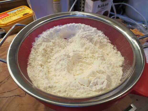 Tamiz de 500g de harina con polvo de hornear y bicarbonato de soda en un tazón.