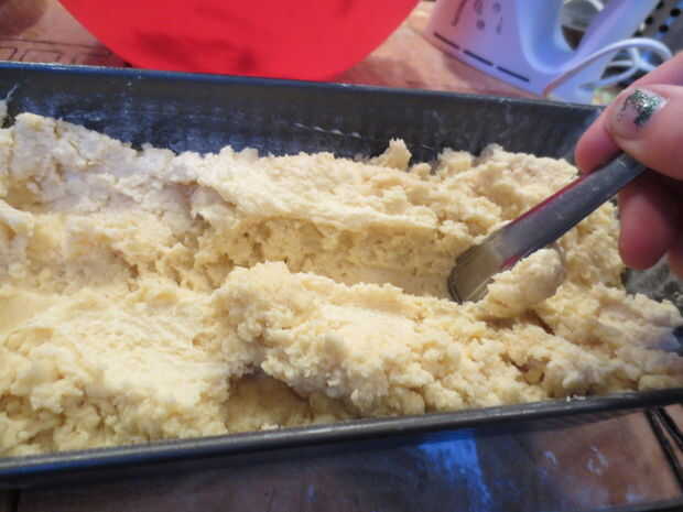 Debe precalentar el horno a 170 º centígrados. Rellenar la masa en un molde rectangular enmantecado, cruzar una cuchara a través de la masa y darle la tarta en el horno por alrededor de 80 minutos.