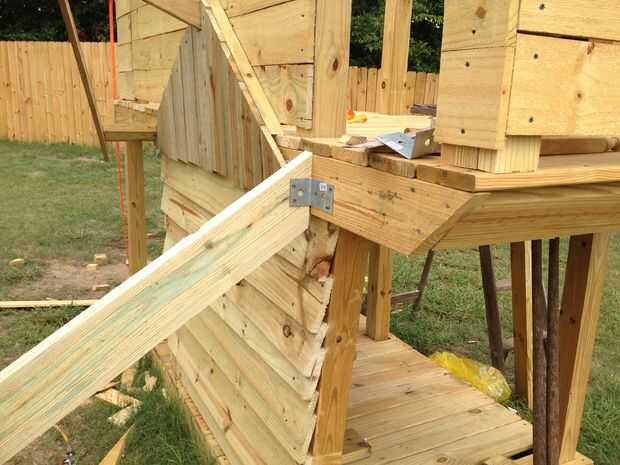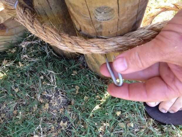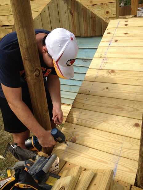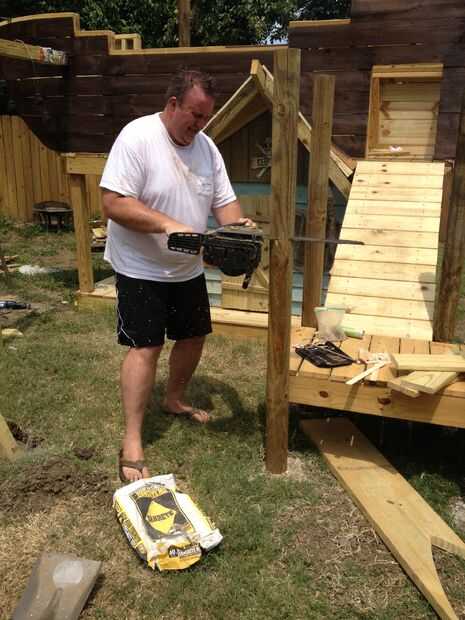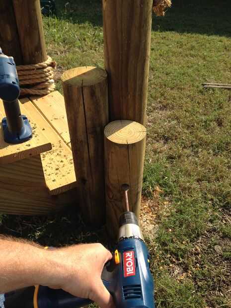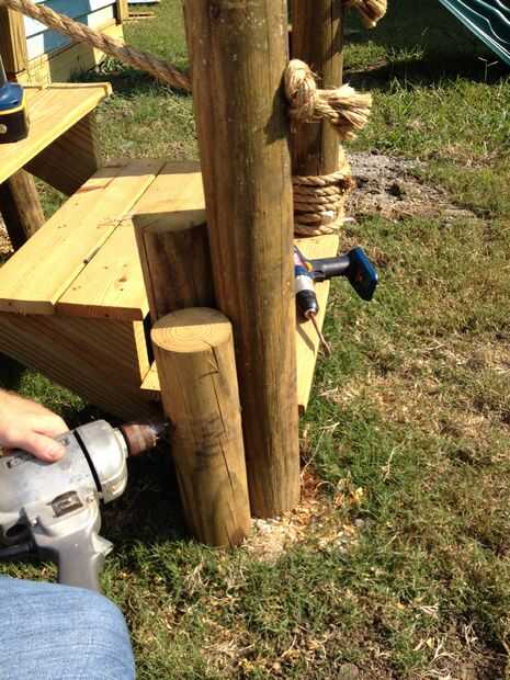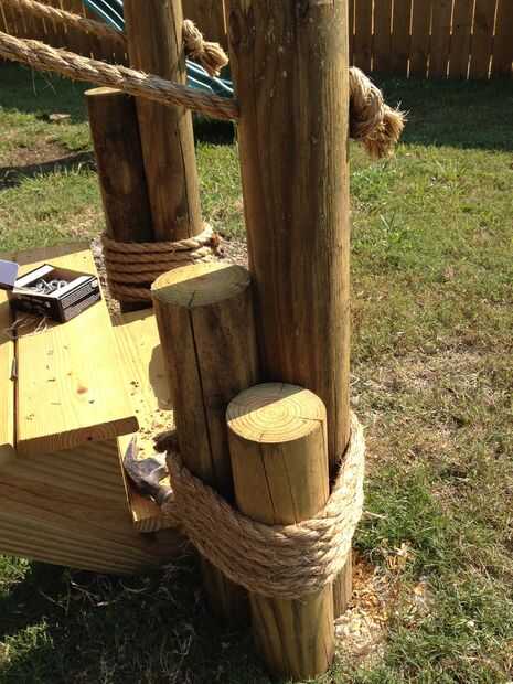 Mi yerno había construido el muelle utilizando postes y materiales para suelos regulares. Todos los puestos están anclados en el suelo con quickcrete. Utiliza pasos precortadas y construir la cubierta para que coincida con su altura. Hicimos la base de 24" de ancho por lo que podríamos obtener de cuatro tablones por tablero de la cubierta. Los tres puestos a cada lado de la parte inferior de las escaleras se atornillan con tornillos de 6" y luego la cuerda fue herida alrededor de cada uno. La cuerda se sujeta con grapas de la cerca.