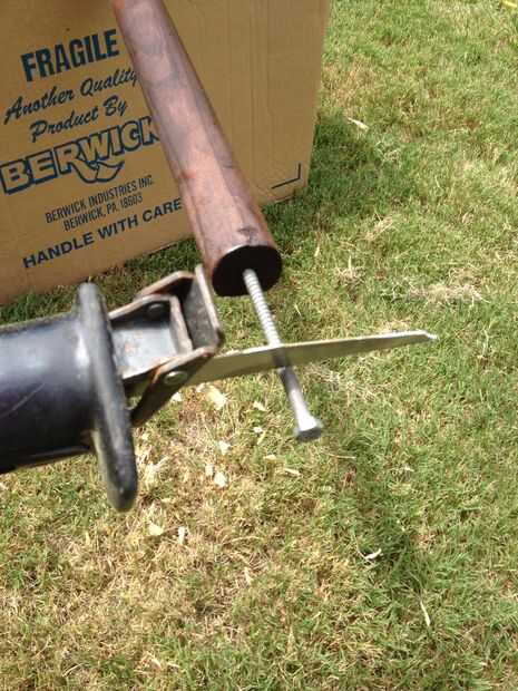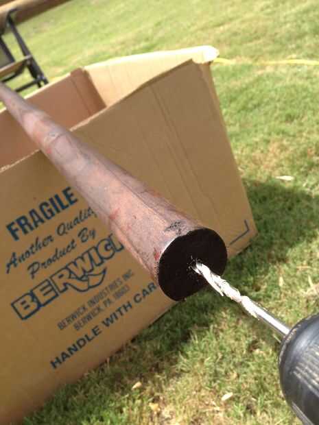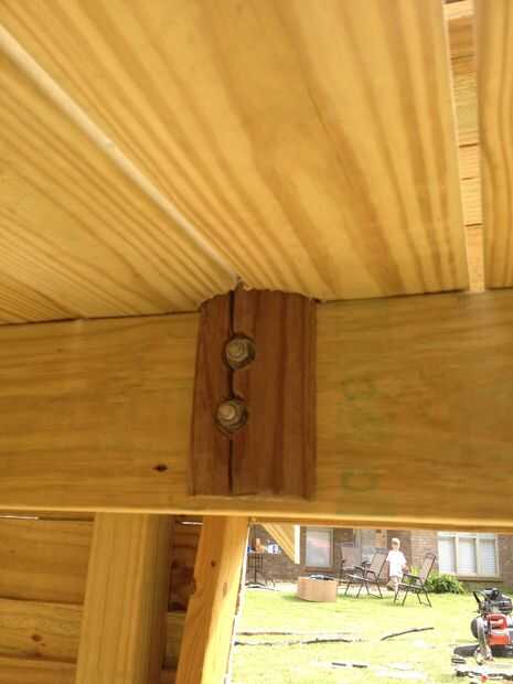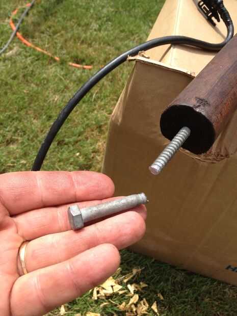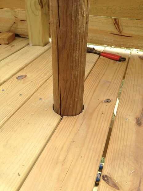 Para asegurar el mástil de la nave muescas en la parte inferior del mástil para caber firmemente en el soporte de la cubierta de 2 x 6. Corté un agujero redondo con una sierra de gran tamaño agujero que encontré en el puerto de carga herramientas y simplemente se deslizó el mástil a través de ella sobre el apoyo de 2 x 6. Como sostuve plomo en todas las direcciones mi yerno agujeros perforados, inserta los pernos y todo había apretado hacia abajo.