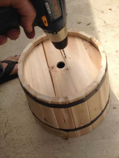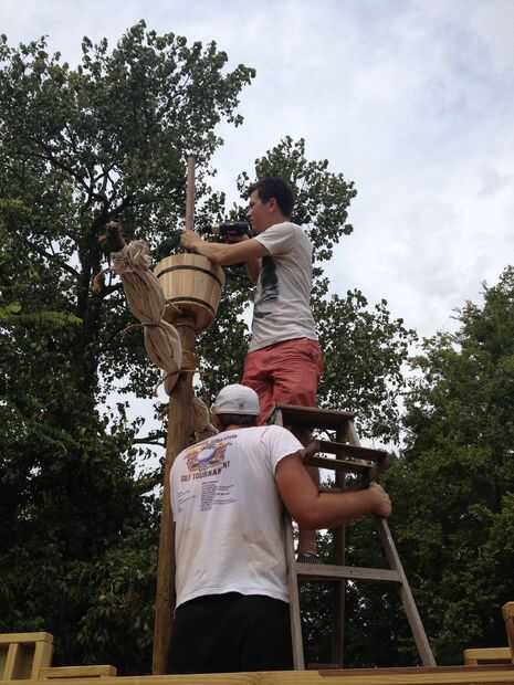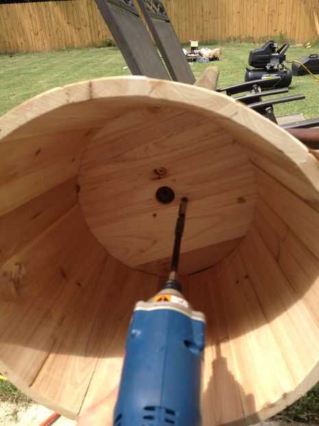 Encontré un plantador de cedro en vieja cerámica de tiempo a utilizar como nido de cuervo. Había jodido el cuervo de nido en el mástil principal con tres tornillos y luego después de taladrar un agujero piloto en el mástil asegura el asta de la bandera a la it.