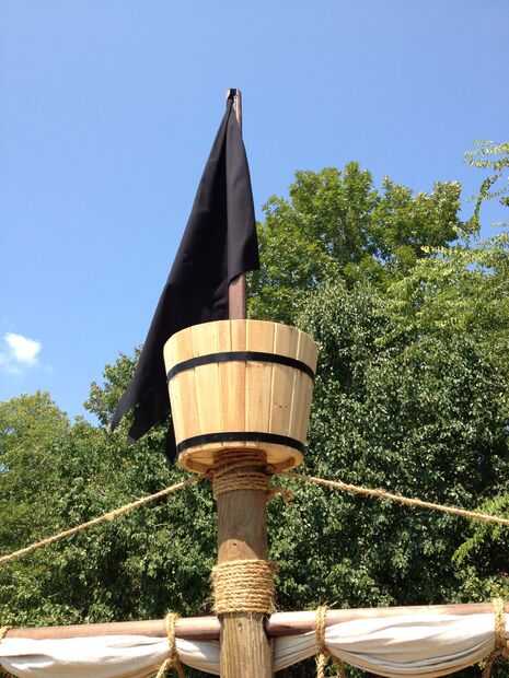 Encontrar una rueda de carro antiguo en un mercado de pulgas, agrega manijas hechas de forma de los titulares de vela miniatura Hobby Lobby para la rueda de un capitán e instalado en la proa de la embarcación que cubre la parte posterior de la correa del metal que habíamos usado para apoyar el arco.