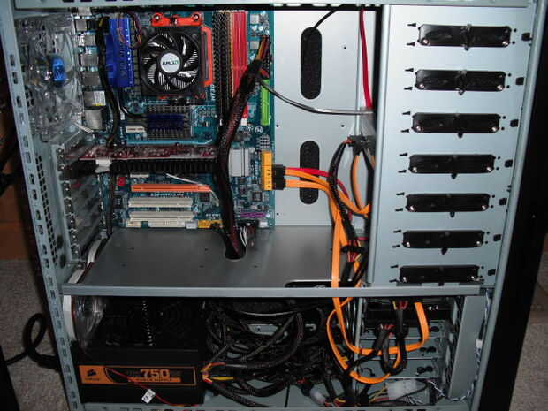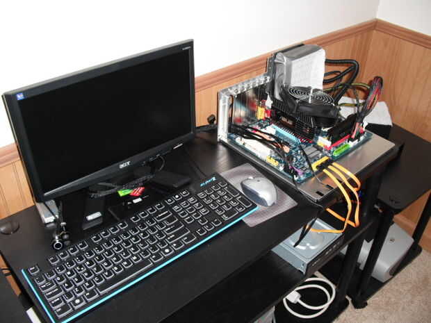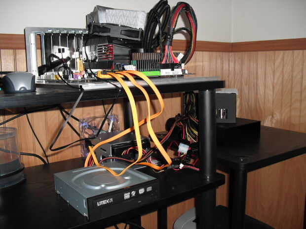 Una PC no necesita estar contenido en un caso, algunas personas prefieren las monte en lo que se llama un estante de la tortura, si no has visto uno, básicamente se trata de una pequeña estantería que consta de 2 estantes, montaje de la placa base y todo conectado directamente a él, en la parte superior y el resto de montaje en el estante inferior. Bueno, también puede utilizar una bandeja de la placa madre estándar... mucho más barato que comprar un estante de la tortura, pero carece de la habilidad para montar discos duros y otros componentes sobre el mismo, pero con algunos ajuste y modding podría convertirse en un heck de una instalación. Además es más barato que comprar una caja de todos modos. De un sitio comprar una bandeja de Motherboard, Tarjeta madre, echa un vistazo: Rendimiento PCs.com.