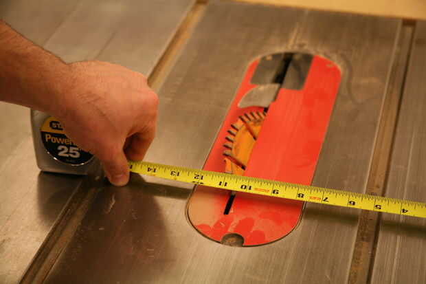 - Ahora puede ajustar la guía para que sea exactamente 11 pulgadas desde este punto de la hoja. (También puede tomar su dimensión y reste el espesor de la madera. En mi caso sería 10 1/2 pulgadas. Puede entonces establecer la cerca en medida y obtener el mismo efecto dependiendo de la fiabilidad de la Sierra de mesa).