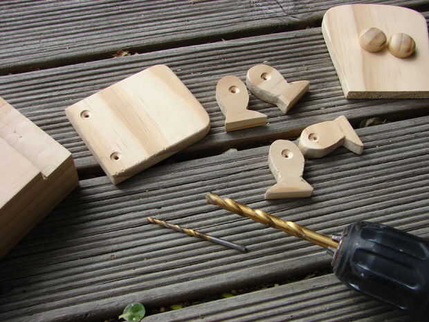 Con una broca pequeña (conveniente para sus tornillos), taladre los orificios de guía de la pierna (a 25mm desde la base del pie). Taladre dos orificios guía para los tornillos de la factura (unos 10mm en su base). Contador puede hundirse los agujeros con una broca más grande al revés (esto ayuda a que los tornillos sentarse a ras con la superficie de la madera).