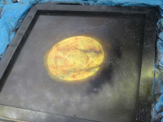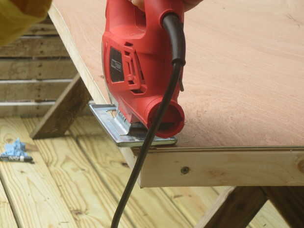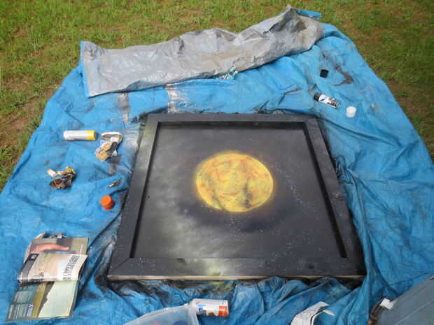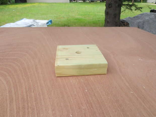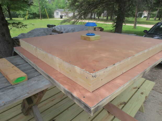 Apila madera contrachapada en la parte superior de 2 x 4 puesto hacia abajo y luego a pie de 2 x 6. La tercera capa era un cuadrado de 2 x 6 establecido con un agujero perforado en el en la parte superior para sujetar la lámpara. Después de eso aerosol pintado el techo usando un bote de basura para la cubierta.