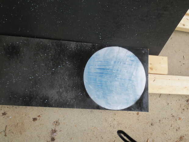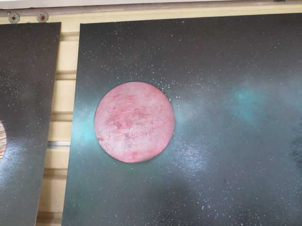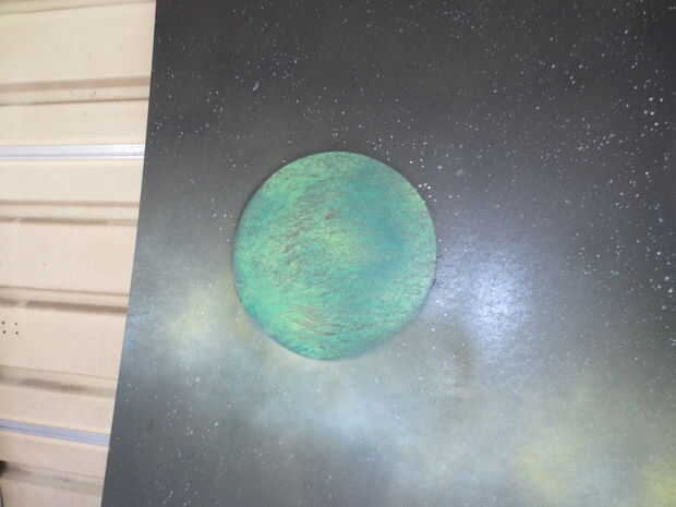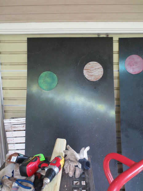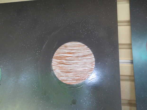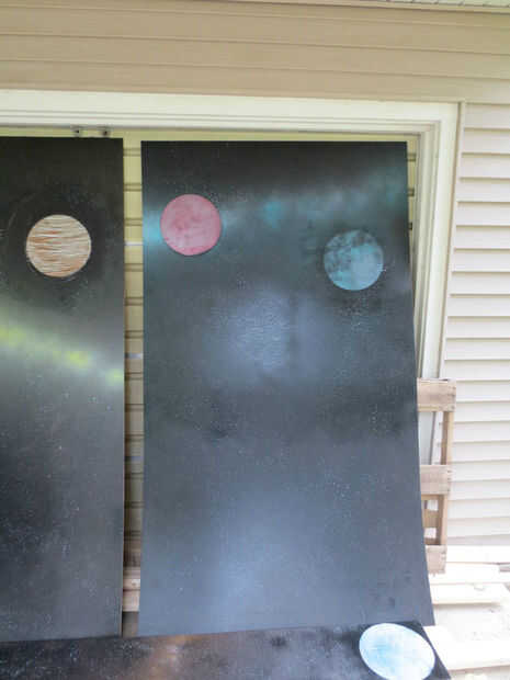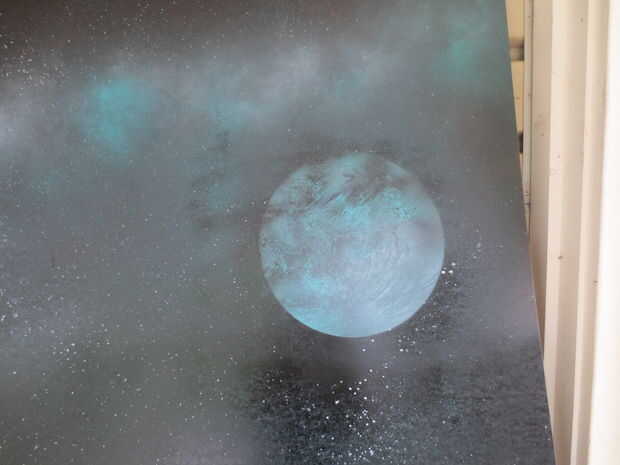 Para las paredes interiores me pareció una manera de hacer la mirada de Tardis más grande en el interior pintar una escena de espacio. Por supuesto hay muchas otras maneras para que se vea más grande en el interior, sólo pensé que esto sería más "spacey wacey'. He oído que una manera es usar "espejo de papel". Esto fue lo único que pude hacer ese día. El único problema que teníamos era debían cortar las paredes abajo al día siguiente en el orden de la Tardis caber en el sótano después de la fiesta.