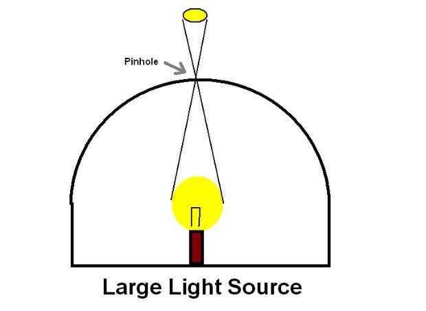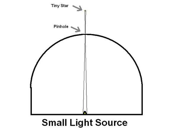 En nuestro caso, el efecto de lente no hace un cambio visible en nuestras luces, puesto que la fuente es redonda y la proyección es redonda, a través de un agujero redondo. Una cosa importante que debe tenerse en cuenta al elegir su fuente de luz es esto; una fuente de amplia luz hace una gran proyección, y una pequeña fuente de luz hace un pequeño saliente. Queremos estrellas punta pequeña, por lo que la fuente más brillante más pequeño posible. Visualizar los diagramas en este paso para nosotros.