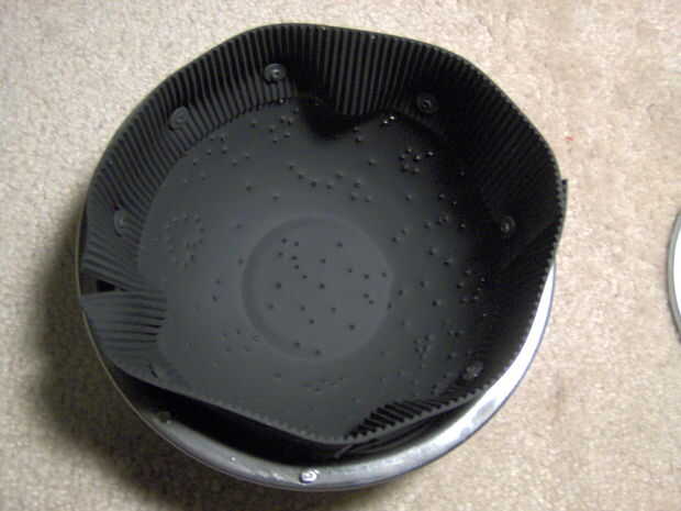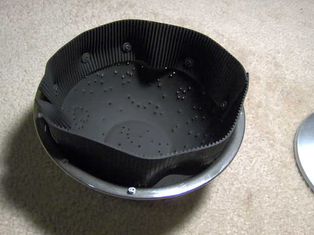 Ya que el tazón de fuente y la base probablemente no será opaco, como era mi problema, tenemos que sellarlo. Nosotros no podemos sellar permanentemente, así que necesitamos una manera de bloquear la luz que podemos eliminar fácilmente. Lo que hice fue perforar agujeros grandes cerca del labio del recipiente y del remache de una hoja de goma en el interior. Este se desliza hacia abajo en la base y bloquea la luz de lo LED que podría haber escapado a través de la grieta.