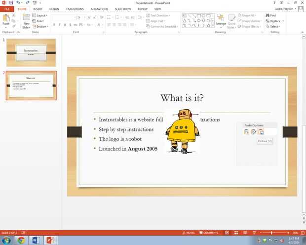 Otra manera de hacer su presentación es mejor a tener ayudas visuales mediante cuadros sobre el tema. Al agregar imágenes a una diapositiva debe ser claro, simple y tiene que ver con lo que se está discutiendo. Para añadir imágenes puede buscar el internet para cualquier cosa que usted desea. Cuando encuentre una imagen que desea utilizar, haga clic derecho en la foto, seleccione "copiar", luego volver a la diapositiva. A tu lado entonces click derecho nuevamente y seleccione "pegar". Luego puede mover la imagen a su lugar deseado. También puede ajustar el tamaño de la imagen arrastrando los bordes de la imagen. También puede utilizar fotos desde tu ordenador haciendo clic en "archivo" y luego "open". Desde aquí, puede seleccionar la carpeta donde se encuentran tus fotos.