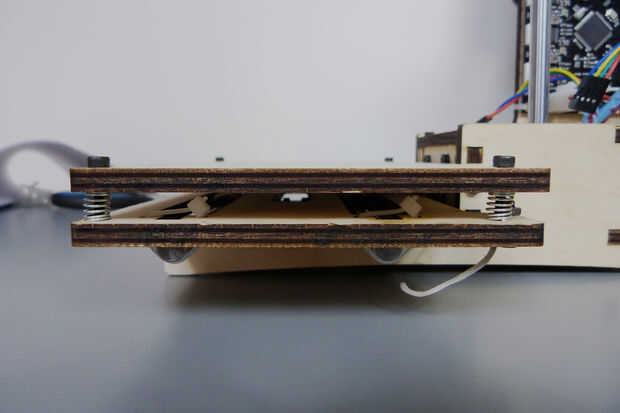 -Alinear la parte 1 de madera encima de los muelles de la cama y enrosque los tornillos de 20 mm de M3 a través hasta que esté al ras con la parte inferior de las tuercas debajo de