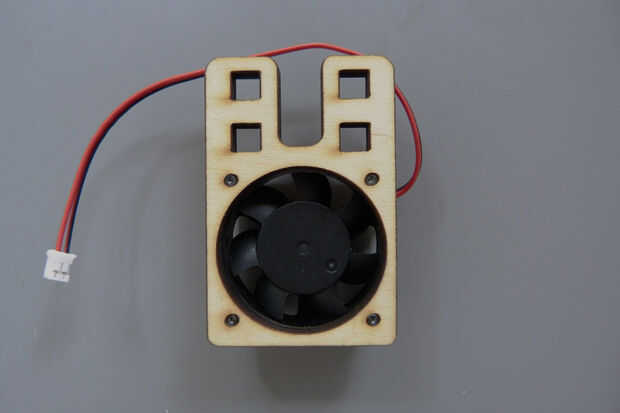 -Apriete el ventilador en la parte de madera como se muestra (Nótese el sentido de cableado del ventilador)