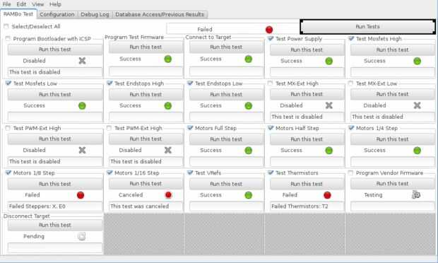Hay unas pruebas genéricas, como el TestGPIO en gpio.py y TestAnalog analog.py que a su vez tiene más específico probar las clases que se derivan de ellos como TestMosfets y TestEndstops que se derivan de TestGPIO y TestThermistors, TestVRefs y TestSupplyRails que se derivan de TestAnalog. Hay también algunas pruebas específicas como la ProgramFirmware que es un contenedor de prueba para avrdude y TestMotors que probar motores paso a paso y comprobar que todo funcionan correctamente.