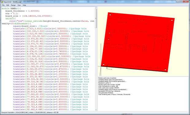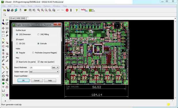 El primer elemento no es evidente en la lista es un modelo 3D de su PCB. Tendrá que generar un modelo de OpenSCAD del PCB que desea probar. Hay un EagleToOpenScad ULP (escrito por Steve Kelly) para Eagle que es muy útil en este caso, simplemente ejecutar el ULP, seleccione (20) dimensión, extrusión, agujeros regulares, Solamente la tabla y vias de Skip y luego generar el modelo de scad de la PCB (ver imágenes arriba). Otro software de diseño de PCB puede tener un script similar, o puede exportar los archivos en el formato de águila.
