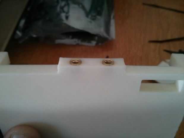 El siguiente paso es preparar las piezas impresas 3D para su uso con la plantilla de prueba. El tablero superior por ejemplo necesitará tener insertos de calor instalados en él. Lo mismo se aplica para el montaje del motor y montaje opto-tope. Si no desea utilizar insertos de calor, usted puede desactivar en el archivo configuration.scad y regenerar la STL, entonces usted puede utilizar pernos y tuercas para asegurar todos los componentes.
